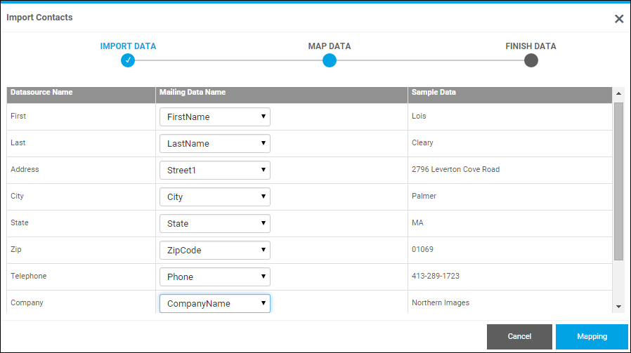 7. Après avoir cliqué sur Importer, mappez les champs de votre liste de contacts aux champs (nom, adresse, ville et ainsi de suite) requis pour l'envoi de tout matériel imprimé qui est partie de la campagne CMM. La colonne Nom de la source de données répertorie les noms des champs de votre liste de contacts ; la colonne Noms des données d'envoi répertorie les noms des champs requis pour expédier le matériel imprimé. Sélectionnez les champs correspondants corrects dans la colonne Noms des données d'envoi. (Certains champs peuvent être associés automatiquement si leurs noms sont similaires.)