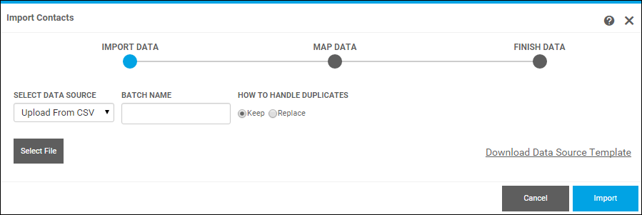 1. Si vous prévoyez d'importer des contacts à partir d'un fichier CSV et n'êtes pas sûr du type de données que vous devez fournir, cliquez sur Télécharger modèle de source. Un fichier nommé DSMxContactUpload.csv est enregistré dans votre dossier Téléchargements. Vous pouvez utiliser ce fichier comme base pour votre propre fichier CSV.